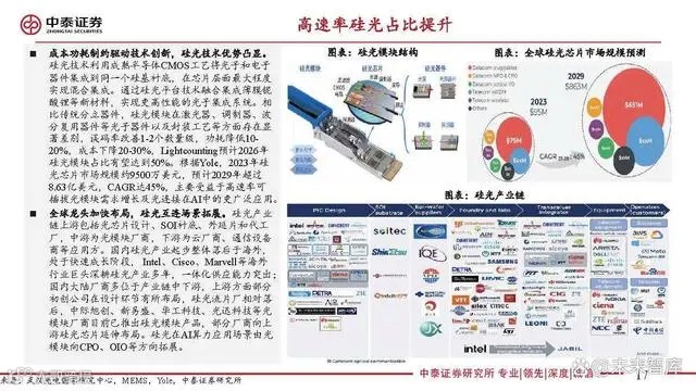 成本功耗制约驱动技术创新,硅光技术优势凸显。硅光技术利用成熟半导体CMOS工艺将光子和电子 器件集成到同一个硅基衬底,在芯片层面最大程度 实现混合集成。通过硅光平台技术融合集成薄膜铌 酸锂等新材料,实现更高性能的光子集成系统。相 比传统分立器件,硅光模块在激光器、调制器、波 分复用器件等光子器件以及封装工艺等方面存在显 著差别,误码率改善1-2个数量级,功耗降低10- 20%,成本下降20-30%,Lightcounting预计2026年 硅光模块占比有望达到50%。根据Yole,2023年硅 光芯片市场规模约9500万美元,预计2029年超过 8.63亿美元,CAGR达45%,主要受益于高速率可 插拔光模块需求增长及光连接在AI中的更广泛应用。