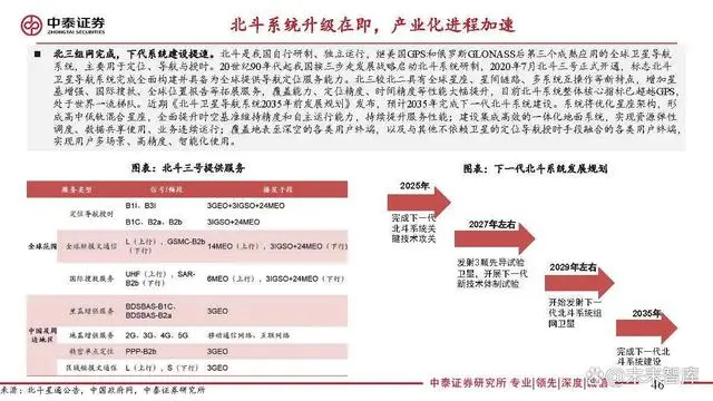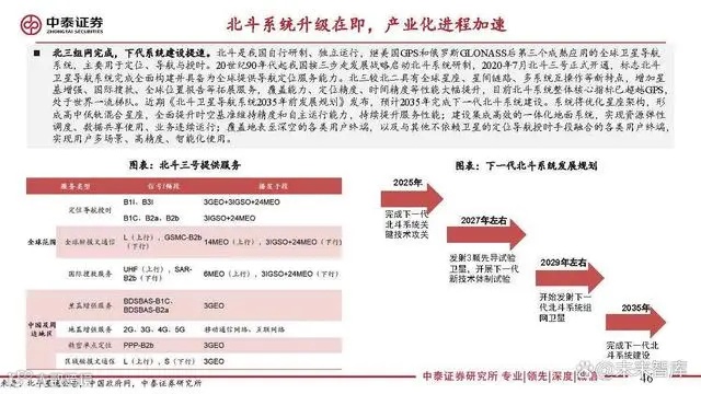 北三组网完成,下代系统建设提速。北斗是我国自行研制、独立运行,继美国GPS和俄罗斯GLONASS后第三个成熟应用的全球卫星导航 系统,主要用于定位、导航与授时。20世纪90年代起我国按三步走发展战略启动北斗系统研制,2020年7月北斗三号正式开通,标志北斗 卫星导航系统完成全面构建并具备为全球提供导航定位服务能力。北三较北二具有全球星座、星间链路、多系统互操作等新特点,增加星 基增强、国际搜救、全球位置报告等拓展服务,覆盖能力、定位精度、时间精度等性能大幅提升,目前北斗系统整体核心指标已超越GPS, 处于世界一流梯队。近期《北斗卫星导航系统2035年前发展规划》发布,预计2035年完成下一代北斗系统建设。系统将优化星座架构,形 成高中低轨混合星座,全面提升时空基准维持精度和自主运行能力,持续提升服务性能;建设集成高效的一体化地面系统,实现资源弹性 调度、数据共享使用、业务连续运行;覆盖地表至深空的各类用户终端,以及与其他不依赖卫星的定位导航授时手段融合的各类用户终端, 实现用户多场景、高精度、智能化使用。