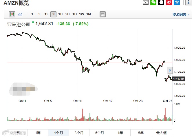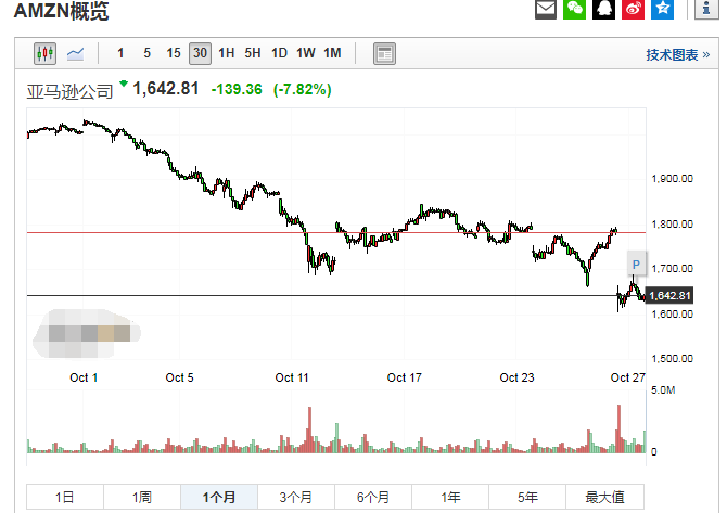 不过,之后亚马逊股价便一路走低,在9月27日到10月27日的一个月时间内,亚马逊股价下跌了16.81%,股价从2012.98美元跌到1642.81美元。
