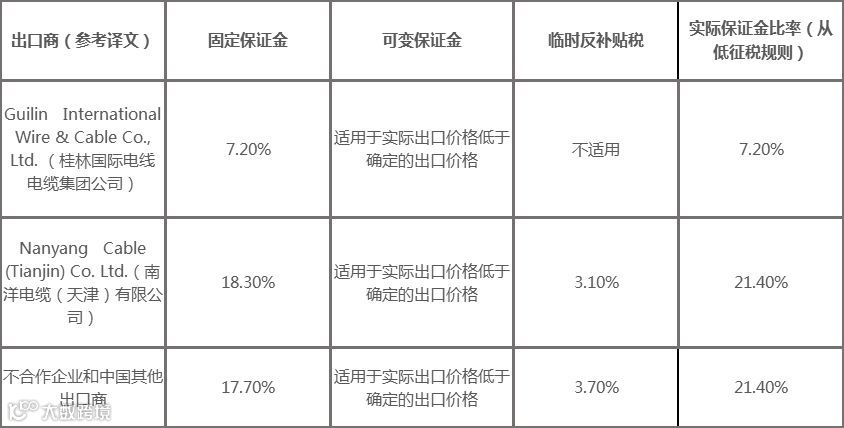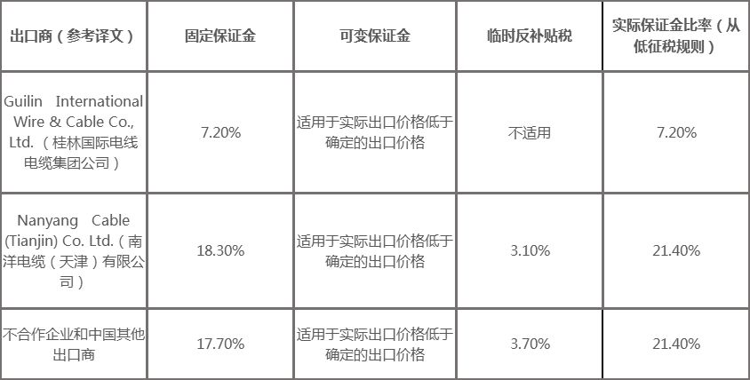 2019年2月22日,澳大利亚反倾销委员会发布第2019/25号公告称,对进口自中国的聚氯乙烯扁平电缆(PVC Flat Electrical Cables)反倾销和反补贴初裁结果进行修改,决定自2019年2月25日(包括当日)起,以固定税和可变税组合方式征收保证金作为临时反倾销税或反补贴税,修改后的税率如下表所示。