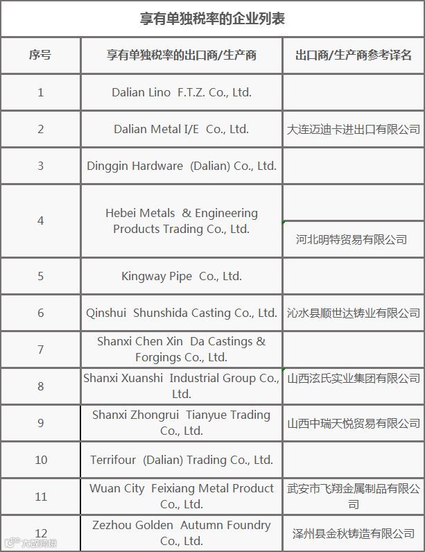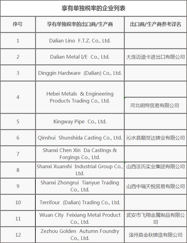 (1)强制应诉企业运城市绛县开发区恒通铸造有限公司(Yuncheng Jiangxian Economic Development Zone HengTong CastingCo. Ltd.)、享有单独税率的企业(名单详见下表)和中国其他生产商和出口商的倾销率均为235.93%。