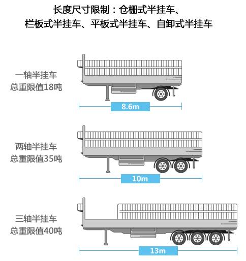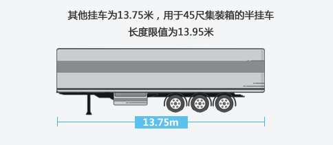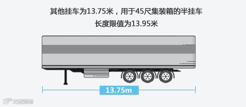 2.仓栅式、栏板式、平板式、自卸式半挂车长度不变,其它半挂车长度限值13.75米,运送45英尺集装箱的半挂车长度最大限值为13.95米,封闭式厢式半挂车从14.6米减少到了目前的13.75米。