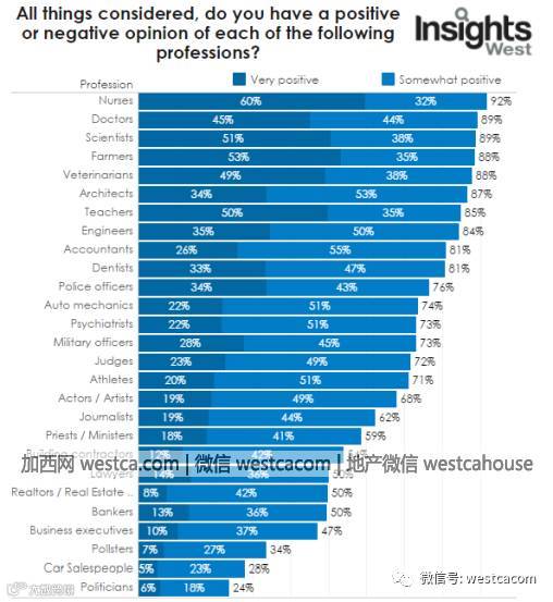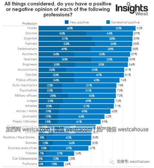 另外,各个省和地区,以及不同年龄人士对职业的想法也会有差别。在卑诗省,就有54%的人对地产经纪人印象很差。
