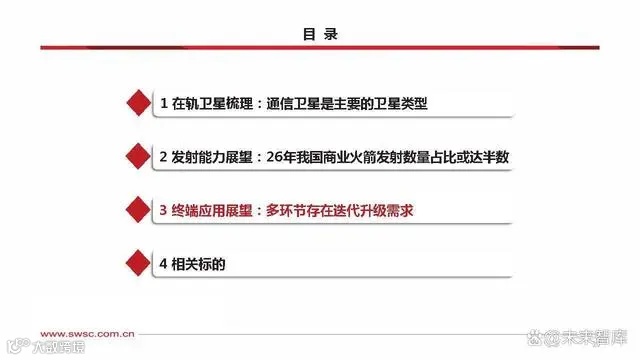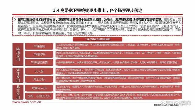 随着卫星通信技术的不断发展,卫星终端逐渐在各个领域落地应用,为陆地、海洋和航空等场景带来了显著的变革。陆地方面,实 现车顶高速通信、车载网络数据传输与车辆数据采集;海洋中,无人船和浮标用于监测并回传数据;航空里,载重和巡检侦察无人 机在救灾、巡查中回传信息辅助决策。如中国联通在2024联通合作高效通伙伴大会上正式发布“领航者相控阵”卫星通信产品, 该产品具备电扫技术与抗干扰强等性能,重量轻、尺寸小,应用场景广泛且兼容性强,能满足中国内陆及部分近海区域使用,在陆 地、海洋、航空等领域都有重要应用,为各行业提供信支持。
