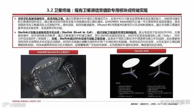 改进手机直接连接模式,直连高轨卫星。通过在普通手机中增加卫星通信芯片,实现手机与卫星及运营商基站双连接的能力,地面移动通信 和卫星通信相对独立,通过模式间的切换来实现与地面基站或卫星的通信。如HUAWEI Mate60依托天通一号卫星系统实现语音通话,是全 球首款支持卫星通话的大众智能手机,提供语音、短信和数据服务。iPhone14利用高通X65基带芯片及定制射频模块,通过全球星卫星通信 服务发送求救信息,实现紧急求助功能。