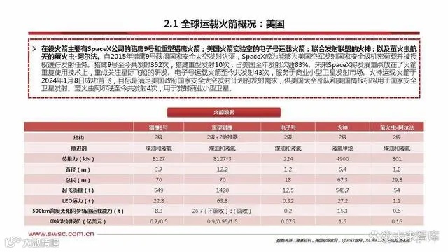 在役火箭主要有SpaceX公司的猎鹰9号和重型猎鹰火箭;美国火箭实验室的电子号运载火箭;联合发射联盟的火神;以及萤火虫航 天的萤火虫-阿尔法。自2015年猎鹰9号获得国家安全太空发射认证,SpaceX成为能够为美国空军发射国家安全级机密荷载并被授 权进行发射任务。猎鹰9号至今共发射352次,猎鹰重型发射10次,占美国全年发射次数83%。未来SpaceX将发展重点放在了火箭 重复使用技术上,重点关注星际飞船的研发。电子号运载火箭至今共发射43次,服务于商业小型卫星发射市场。火神运载火箭于 2024年1月8日成功首飞,目标是满足美国政府国家安全太空发射计划的发射需求,供美国太空部队和美国情报机构用于国家安全 卫星发射。萤火虫阿尔法至今共发射4次,用于发射商业小型卫星。