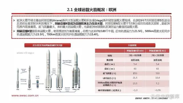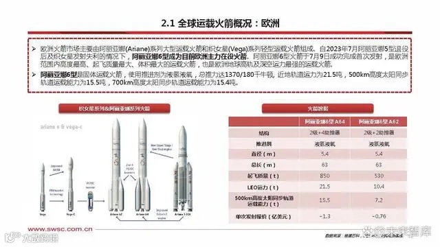 欧洲火箭市场主要由阿丽亚娜(Ariane)系列大型运载火箭和织女星(Vega)系列轻型运载火箭组成。自2023年7月阿丽亚娜5型退役 后及织女星发射失利的情况下,阿丽亚娜6型成为目前欧洲主力在役火箭。阿丽亚娜6型火箭于7月9日成功完成首次发射,是欧洲 范围内高度最高、起飞质量最大、体积最大的运载火箭,也是欧洲地球高轨及深空运力最强的运载火箭。