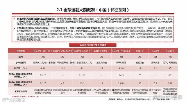 长征系列火箭是我国的主力运载火箭。各类型号包括2号至11号及各自改型,其中运力最大的火箭为长征五号,近地轨道载荷运载能力可达25吨。长征 六号X改型/长征九号/长征八号R等改型是我国正在研制的可重复使用的各型号运载火箭,具备一子级/助推器垂直定点返回能力,将对标SpaceX成为未 来低轨卫星发射的重要运载力量。