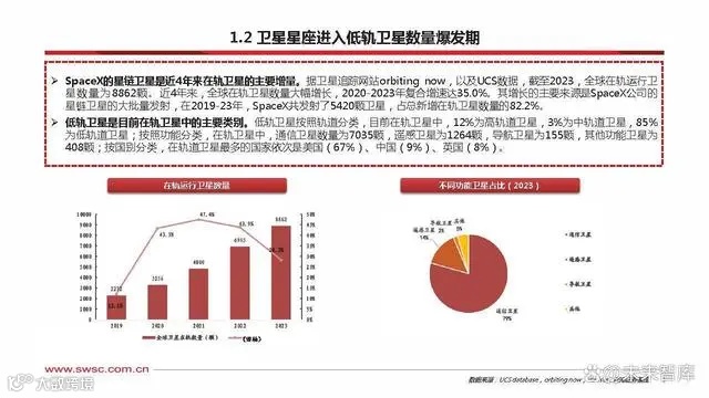 SpaceX的星链卫星是近4年来在轨卫星的主要增量。据卫星追踪网站orbiting now,以及UCS数据,截至2023,全球在轨运行卫 星数量为8862颗。近4年来,全球在轨卫星数量大幅增长,2020-2023年复合增速达35.0%。其增长的主要来源是SpaceX公司的 星链卫星的大批量发射,在2019-23年,SpaceX共发射了5420颗卫星,占总新增在轨卫星数量的82.2%。