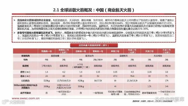 我国商业火箭领域初创企业涌现,包括蓝箭航天、天兵科技、星际荣耀、东方空间、星河动力等商业航天公司均推出了各自的火箭型号,涵盖了液体火 箭和固体火箭等各类燃料型号。据央视网,2023年我国民营火箭共发射13次,同比2022年增加160%,预计我国商业航天产业规模将突破2.3万亿元。海南商业航天二号发射工位能够满足9家火箭公司的19型火箭,目前中科宇航、蓝箭航天、天兵科技等许多国内头部商业航天企业都已经或计划落地文昌 国际航天城,为后续我国低轨卫星大规模组网做好准备,24年预计纯民营的火箭发射次数占我国总发射量比重会达到25%-30%。