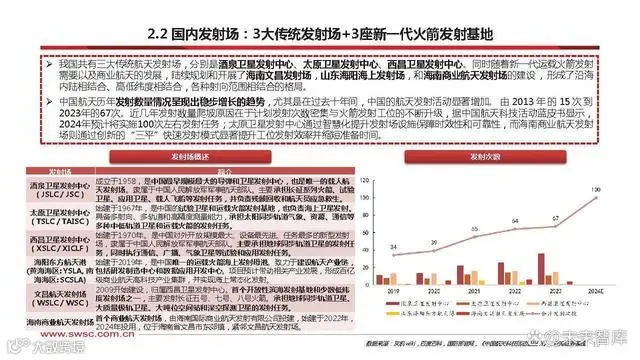 中国航天历年发射数量情况呈现出稳步增长的趋势,尤其是在过去十年间,中国的航天发射活动显著增加。由 2013 年 的 15 次 到 2023年的67次。近几年发射数量爬坡原因在于计划发射次数密集与火箭发射工位的不断升级,据中国航天科技活动蓝皮书显示, 2024年预计将实施100次左右发射任务;太原卫星发射中心通过智慧化提升发射场设施保障时效性和可靠性,而海南商业航天发射 场则通过创新的“三平”快速发射模式显著提升工位发射效率并缩短准备时间。