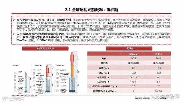 安加拉A5是设计为发射重型载荷的火箭。通过其1个URM-1核心和4个URM-1助推器提供低轨到24.5吨、同步轨道5.4吨的运载能 力。联盟-2是专为低轨道卫星设计的三级运载火箭。联盟-2迄今已发射177次,成功率为96%,通过该火箭发射的载荷包括 OneWeb卫星、GLONASS导航星座、伽利略卫星等,是俄罗斯主力运载火箭。