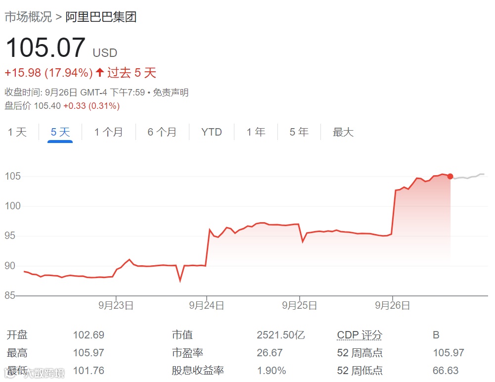 本周截止昨日下午,iShares MSCI中国ETF上涨了18%,阿里巴巴、百度和京东的股价分别上涨了17.94%、17.72%和31.77%。