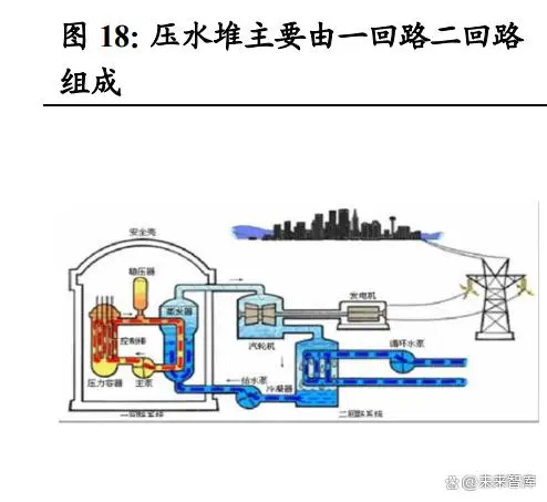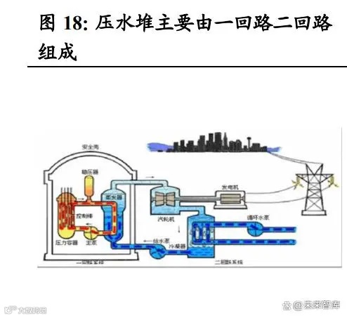 核电以核燃料的链式反应为基础。核反应堆内进行的是核燃料的链式反应。链式反应是一种自持的核裂变过程,其工作原理基于铀-235 这类易裂变核 素的特性。当一个中子被加速并打入铀-235 原子核时,会触发核裂变反应, 使得原本的铀-235 原子核分裂成两个较小质量的新原子核,同时释放出巨 大的能量。在此过程中,除能量外,还会同时释放出 2 至 3 个新的中子以及 其它射线。新产生的中子,如果足够活跃,可以继续与其它铀-235 原子核发 生碰撞,引发更多的核裂变,从而产生更多的中子和能量。所以每一次裂变 不仅释放能量,还为下一次裂变提供了中子,形成了一个自我维持的连锁反 应,即链式反应。为了有效控制链式反应,需要使用慢化剂将这些新产生的 快中子减速,以增加它们与铀-235 原子核碰撞并引发裂变的概率。当快中子 与慢化剂中的轻元素(如水、重水或石墨)原子核发生碰撞时,速度会降低, 从而变成热中子。热中子由于其较低的能量,更容易被铀-235 原子核捕获, 引发裂变。为了确保安全,一回路系统装在一个被称为安全壳的密闭厂房内。相比火电,单位燃料在核反应堆内可以产生更高的热量,这也是核电最大的 优势。
