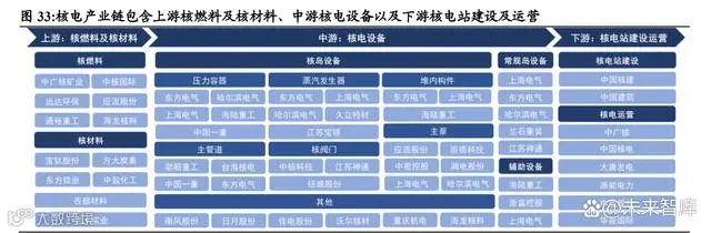 核电设备行业集中度高。核电的产业链可以划分为上游的核燃料及核材料、 中游的核电设备以及下游的核电站建设运营。上游的核电产业链包含了核燃 料的供给以及碳素等核材料的开发。目前,中核集团是国内唯一拥有完整核 燃料循环产业的企业,对核燃料、铀产品的生产经营和进出口实行专营,在 核电产业链的上游拥有了较高的市场份额。在碳素及其他核电材料方面,我 国也有方大炭素、宝钛股份等上市公司提供相应的材料。核电产业链的中游 是核电站设备,也是整个核电产业链中最重要的部分。核电设备可分为核岛 设备、常规岛设备以及辅助设备。其中核岛设备由于制造难度大,建设周期 长,技术壁垒高,行业集中度也相对较高。目前我国的核电主设备制造业主 要为大型国有企业垄断,如上海电气、东方电气以及哈尔滨电气等大型的核 电设备制造商在压力容器、蒸汽发生器等主要的核岛设备的市场中市占率很 高。一些企业如江苏神通、海陆重工等也在特定的核电设备如核电阀门、核电压力容器等设备行业中占据了一席之地。核电下游是核电站的建设及运营 等。目前中广核以及中核集团是我国最主要的核电运营商。大唐发电、浙能 电力、申能股份、华能国际等公司也投资/控股了不同的核电站项目。核电装 机量的快速上升将带动核电全产业链快速发展,核电将迎来崭新的篇章。