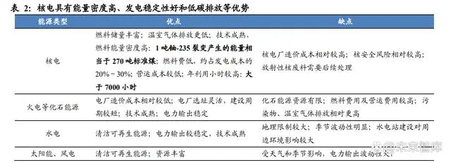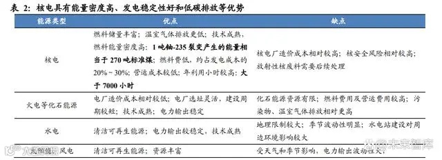 核电清洁高效,优势明显。核电具有能量密度高、发电稳定性好和低碳排放 等优势。从清洁性的角度看,核电在发电过程中不产生温室气体,对环境的 影响相对较小,与化石燃料相比,核电的碳排放量极低。从电力输出的稳定 性角度看,核电的发电量稳定,同时核电机组的年发电利用小时数常年保持 在 7000 小时以上,位居所有电源之首。相较于太阳能、风能等可再生能源, 核电的发电量受天气、季节等外部因素的影响较小。从经济性来看,虽然核 电的初始投资成本较高,但在运营过程中,核电的燃料费用较低,且不受燃料市场价格波动的影响。所以无论是从实现“双碳”目标亦或是建设新型能 源体系的角度看,核电都是重要的能源类型之一。在未来的能源结构中,核 电的地位将更加重要。