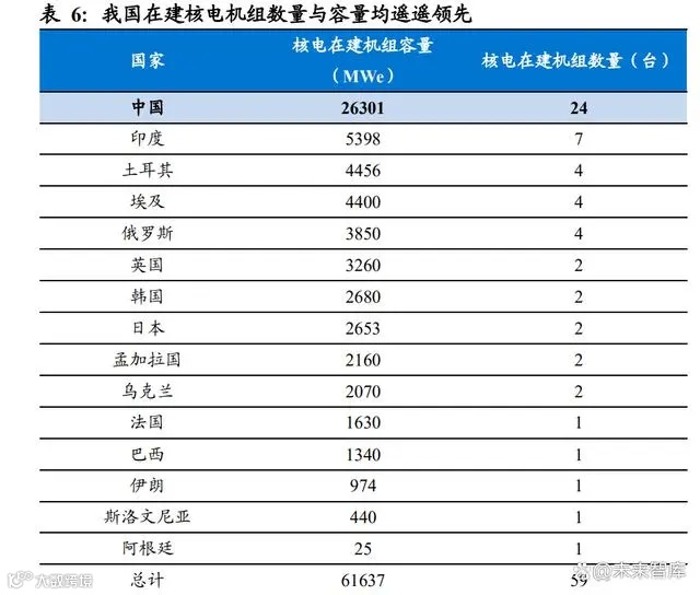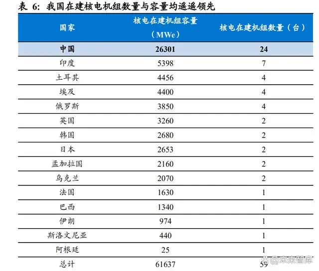 我国核电机组在建数量世界领先。将运行的核电机组按国家拆分,截止 2024 年 5 月,美国拥有世界上最多的核电机组,共 94 台,装机容量达到了 374.597GWe。中国与法国紧随其后,分别拥有 56 台核电机组,容量分别达 到了 54.152 GWe 以及 61.370 GWe。中国拥有的核电站数量已经位居世界 前列。从在建的核电机组角度看,目前中国在建的核电机组数量为 24 个, 容量为 26.301 GWe,位居世界之首,且远高于排名第二名的印度。无论是 已经投运的机组规模还是在建的机组数量、容量,中国的核电发展已经走在 了世界的前列,成为了核电发展的主力军。随着我国碳达峰碳中和目标的提 出,电力系统清洁低碳转型步伐进一步加快,未来随着我国核电技术的进步, 电力输出稳定且资源丰富的核电将在我国得到更广阔的发展。