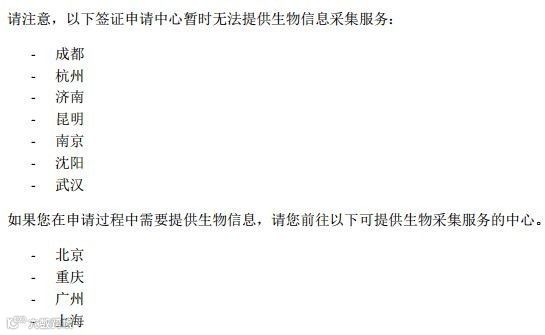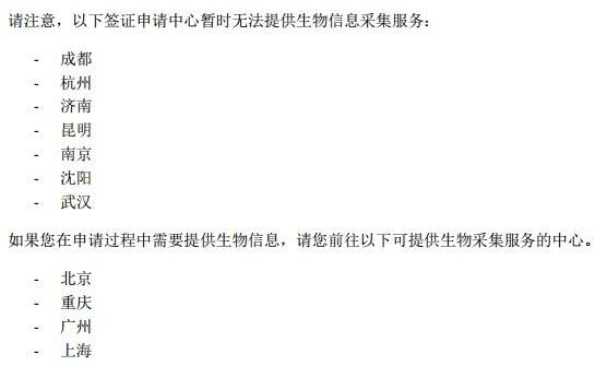 要注意只有4个签证中心可以提供指纹采集服务:北京、重庆、广州、上海!(这无疑加大了申请人的成本和申请复杂程度)