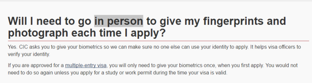 生物采集必须申请人亲自到场录入生物识别信息,意味着和美国签证一样,加拿大签证也必须要面签了。