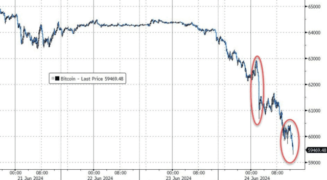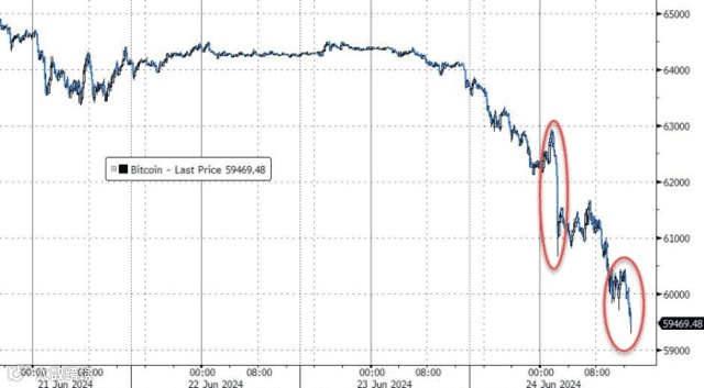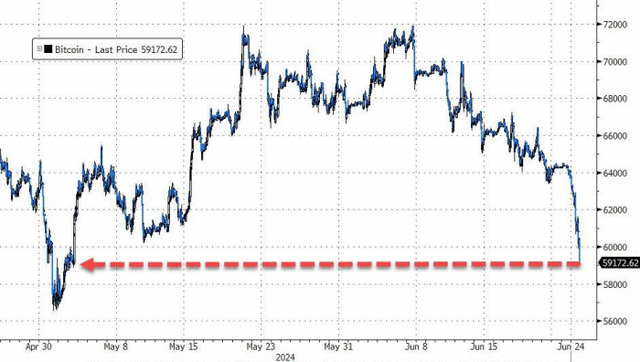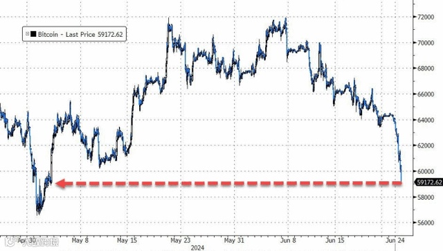 截至周一收盘,比特币价格跌至59191.39美元,创下自5月初以来的新低。本月迄今,比特币已下跌12%。