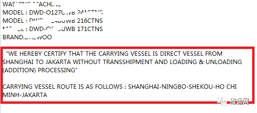 “We hereby certify that the carrying vessel is direct vessel from ... (POL) to Jakarta without transshipment and loading & unloading (addition) processing”