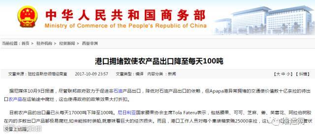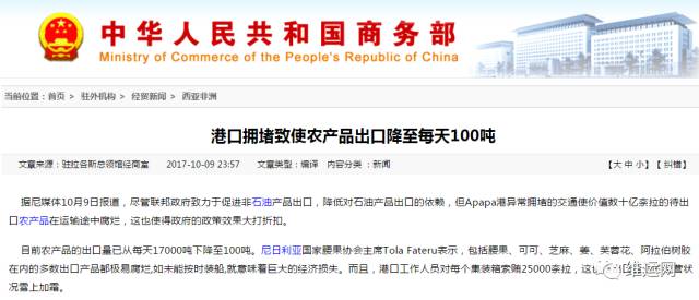 据尼媒体10月9日报道,尽管联邦政府致力于促进非石油产品出口,降低对石油产品出口的依赖,但Apapa港异常拥堵的交通使价值数十亿奈拉的待出口农产品在运输途中腐烂,这也使得政府的政策效果大打折扣。