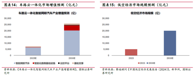 对比车路云一体化和低空经济整体市场规模预测,到2030年,预计车路云一体化产业链整体市场规模达到2.6万亿元,而低空经济产业链整体市场规模约2万亿元,车路云整体规模更大。