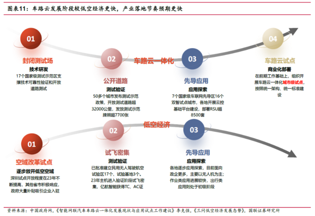 从技术研发→测试验证→应用探索→商业化部署四个阶段来看,车路云一体化产业经历了封闭测试场、公开道路、先导应用、车路云试点四个阶段,低空经济在空域改革试点、密集试飞、先导应用后,仍未进入大规模试点。 对比已发布招投标项目,短期车路云一体化在①路侧感知、网联、云控等基础设施的实际建设;②招投标项目金额和规模;③地方政府资金支持力度三个方面均领先于低空经济,侧面也能够反映车路云产业进度更快。