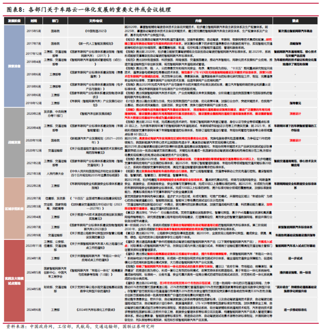 智能网联汽车概念于2015年提出,经历多轮的标准体系建设后,在2020年发布顶层设计文件,目前已处于大规模试点落地阶段。 低空经济的概念虽在2010 年就已提及,但早期政策重点围绕监管,导致产业进展推进相对缓慢;目前顶层设计落地不久,尚未进入大规模试点阶段。 值得注意的是,车路云一体化建设已有更详细的标准框架体系,低空经济有待进一步落定。