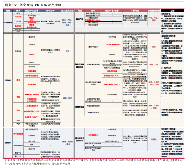 1)主机制造端:智能网联汽车发展速度更快,技术更成熟,未来主要增量为OBU 装载;航空器制造产业链较长,技术壁垒较高,预期未来体量大,但目前仍有技术短板。 2)基础设施端:智能化路侧设施关键技术突破、政策推进快、场景需求大,有望成为车路云一体化中增速最快的板块;低空相关基建前期由政府投入,集中在航路设计、通导监设备、智联网平台搭建等,未来空间大但建设节奏慢。 3)服务平台端:云控平台产值增量有限,但增速可观;空管系统是低空运行的保障,贯穿低空经济发展的始终。