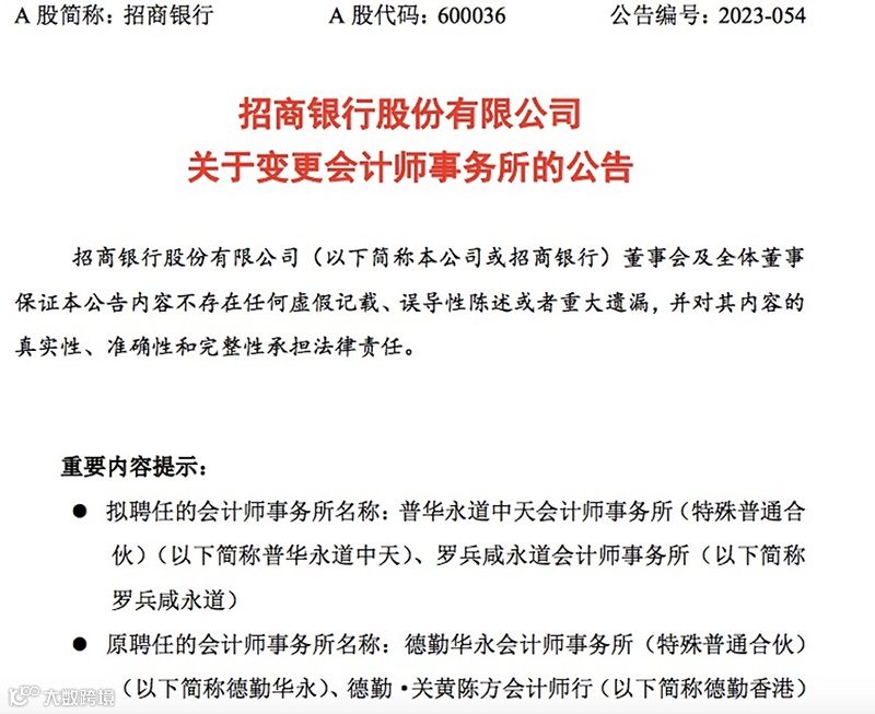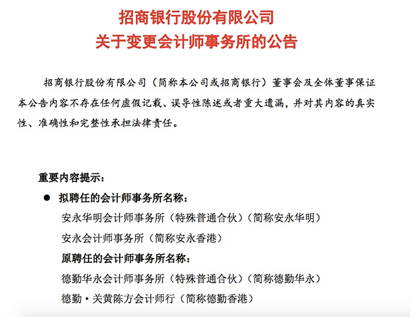 招商银行5月27日晚间公告,拟聘任安永为2024年度审计机构,去年9月拟聘任普华永道为2024年度审计机构的决议自动废止。
