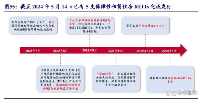 为了构建和完善保障性租赁住房“投、融、管、退”的商业闭环,关于退出环 节,则是鼓励行业对于公募 REITs 等金融工具应用进行探索。保障性租赁住房项目 因其低于市场的租金及舒适的租住体验,开业后往往能迅速保持较高出租率,故通 常具有稳定持续的租金收益。2021 年 7 月公募 REITs 扩容,首次将保障性租赁住房 纳入试点,2022 年 5 月 27 日,证监会与发改委联合发布《关于规范做好保障性租赁 住房试点发行基础设施领域不动产投资信托基金(REITs)有关工作的通知》,推动 保障性租赁住房 REITs 业务规范有序开展。2022 年 8 月,首批三单保障性租赁住房 REITs 上市,形成了良好的示范效应。截至 2024 年 5 月 14 日,已有 5 支保障性租赁 住房 REITs 完成发行。