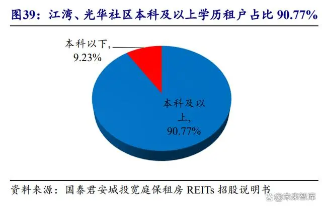 在租赁条件等其他方面,光华社区同江湾社区也是基本一致。截至 2024 年 1 月 中旬两个社区的出租率都很高,均超过 90%,其中光华社区也并没有受到开业较晚 的影响,其出租率更是超过 95%。除了其优越的地理位置外,另外一个因素是其房 源相对较少,市场需求大的一室户占比较大。两个项目空置的房型基本都是 60 平米 左右的一室两厅,这主要是因为该户型更多针对情侣居住,但往往出于价格考虑, 租户会更愿意选择价格低更多的一室一厅甚至单间,或者价格略增但面积更大的二 室户。在租户统计方面,两个项目租户定位多为年轻高知群体,但行业较为分散。其中从事科技行业的租户占比最大,合计为 20.37%。年龄分布方面,江湾社区和光 华社区 40 岁以下的租户占比达到了 93.96%。学历分布方面,本科及以上学历的租户 占比达到了 90.77%。