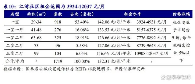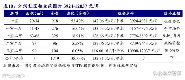 租金方面:29-34 平一室租金范围为 3924-4931 元/月,41-48 平一室一厅租金范 围为 5157-6375 元/月,63-68 平一室二厅租金范围为 7776-8892 元/平,73 平二室二 厅租金范围为 8739-9643 元/月,99 平三室二厅租金范围为 10908-12037 元/月。截至 定价时点 2022 年 8 月,江湾社区项目备案租金为 141.1 元/月/平米,同地段同品质 市场租赁住房租金为 156.8 元/月/平米,即江湾项目备案租金低于同地段同品质市场 租赁住房租金 90%。后续经营期内,每年租金涨幅低于 5%,租赁合同期内的,租金 不作调整。