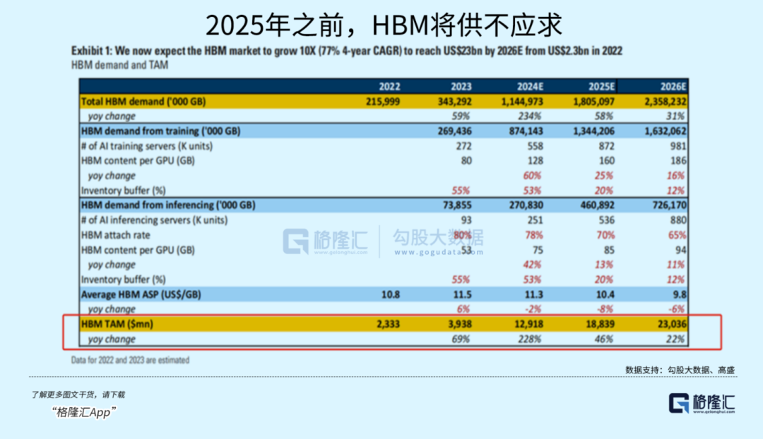 需求如此旺盛,高盛因此大幅提高了HBM总市场规模预估,从22年的23亿美元增长到26年的230亿美元,4年10倍,每年的复合增长率高达77%。
