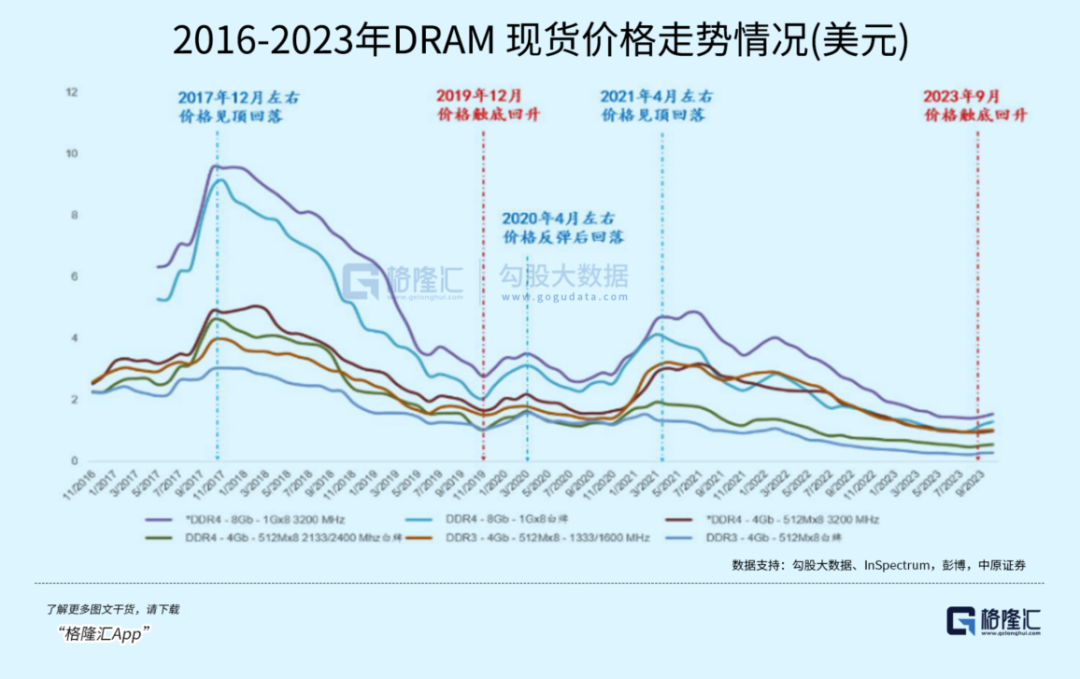上一轮存储芯片周期大概在2021年2-3季度见顶回落,经历了两年左右的下行周期。自去年9月以来,DRAM和NAND的现货价格开始触底回升,从去年10月到今年2月,部分现货价格反弹幅度达到20%以上。