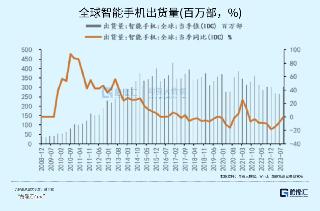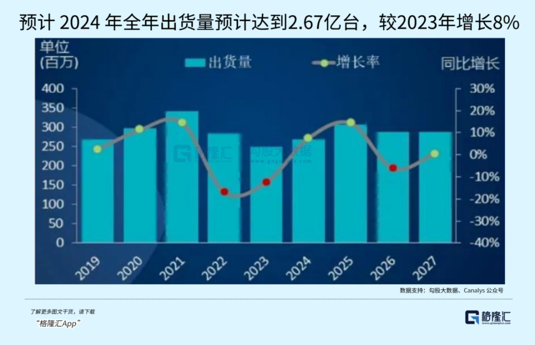 去年四季度,全球智能手机出货量同比增长8%,PC出货量同比增3%。