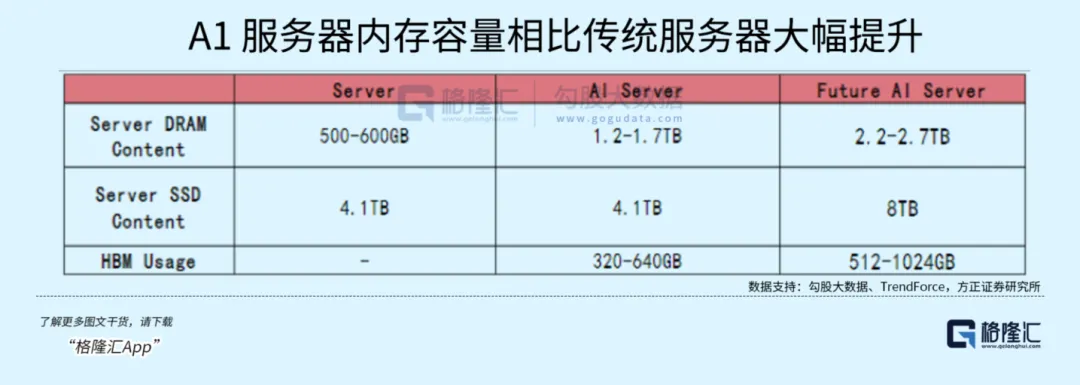 例如,英伟达训练型AI服务器中的CPU DRAM容量可高达2TB,而单个GPU通常搭载80GB以上的HBM存储器。
