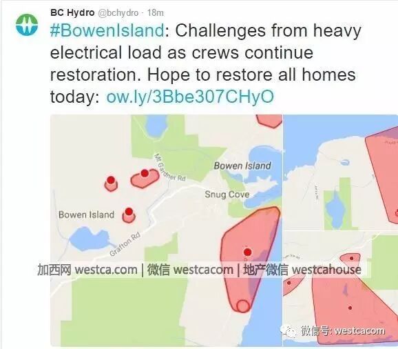 前两天的大雪及大风,造成大温、菲沙河谷及温岛、海湾群岛的等地83,000上万用户失去电力供应。经过BC水电局的员工的抢修,今天已经有76,000用户恢复电力供应。