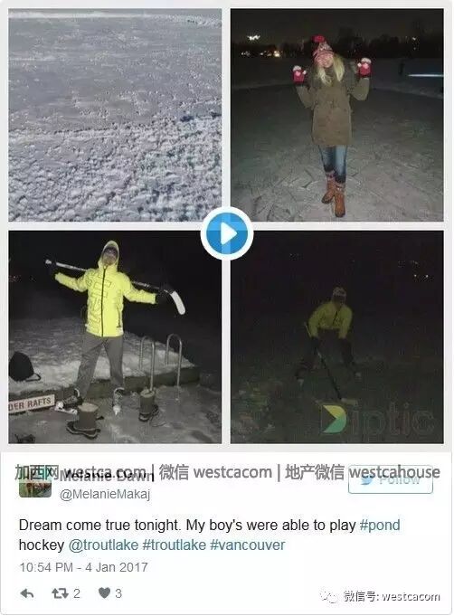好多市民对鳟鱼湖十多年来第一次结冰对民众开放,表示梦想今晚成真,让家里的儿子也可能玩湖上冰球。