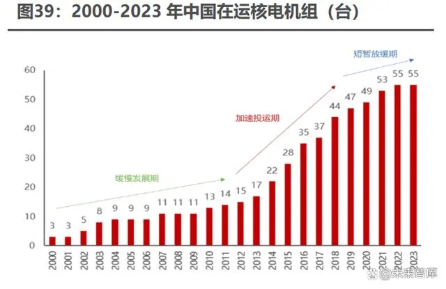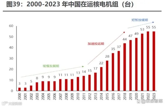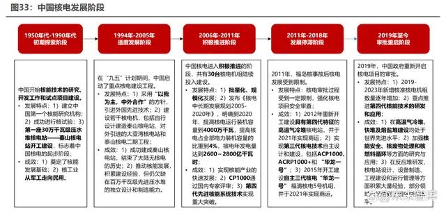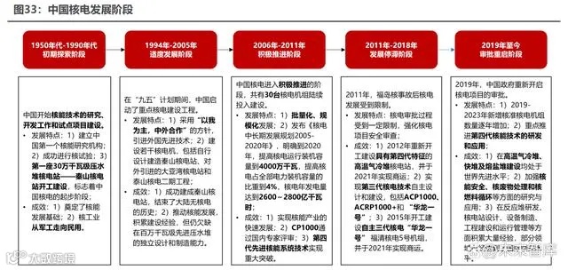 从起步到创新,中国核能引领全球核电建设。中国的核能发展经历了多个阶段:1)初期探索:上世纪五十年代建立核能研究机构并成功进行核试验,建设了秦山 核电站。2)适度发展:从 1994 年开始采取“以我为主,中外合作”的方针,建 设若干核电机组,推动核能发展。3)积极推进:从 2006 年起,中国大规模投资 建设 30 台核电机组,明确到 2020 年,提高核电运行装机容量到 4000 万千瓦。4)发展停滞:2011 年,福岛发生 7 级特大事故,也对中国的核电发展带来了挑 战和警醒,中国不断强化核电项目安全审查,核电审批受到一定限制。同期,经福 岛核事故影响后,国内于 2012 年重新开工建设具有第四代特征的高温气冷堆核电 站。5)审批重启:从 2019 年起,中国重新开启核电项目审批,并在 2022-2023 年通过了 20 台核电机组的审批。同时,中国加速研发第四代核能技术,具备核电 出口能力,在核能安全、核废物处理、核燃料循环等方面积累了丰富经验,成为世 界核能发展的领导者。