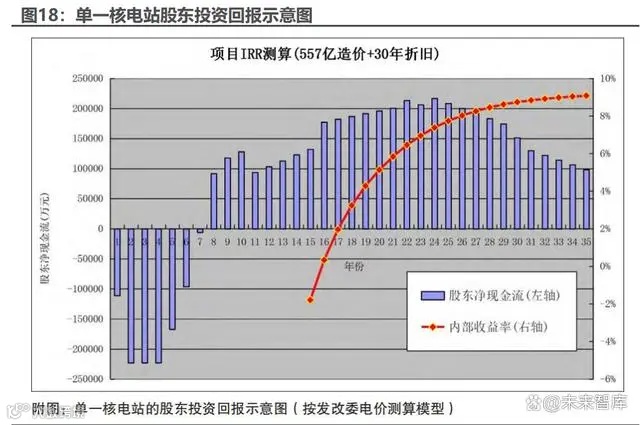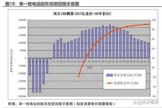 核电站单位造价高,固定成本高,运营成本低,且核电站实际经营期大于折旧 期。单一核电站财务特点包括:1)建设周期长,建设初期投资大,设备成本占比 高,且按完工百分比或者销售件数进行确收;2)全成本,核电站总成本包含乏燃 料后处理费用及退役费用等;3)运营周期长,实际运营期大于折旧期,运营后期 盈利能力强;4)运行维护成本较高,需要考虑多次设备大修、维修等等维护成本;5)财务费用高,核电站投资 80%资金为银行贷款,电站投产后 10-15 是偿贷高 峰期;6)折旧费用高,采用二代核电技术的核电站设计寿命 40 年,综合折旧期 大约是 25 年;采用三代核电技术的核电站设计寿命 60 年,综合折旧期大约是 30- 35 年。核电站投资回收期大约为 17 年,而设计寿命一般为 40-60 年,运营后期盈 利能力较强,长期看具备较稳定的投资价值。根据中国广核总经济师岳林康测算单 一核电站项目收益显示在投产 25-30 年后达到国家核定电价下 IRR=9%水平。假 设核电站总共 557 亿元造价,折旧期按 30 年进行计算,电站运营方在建设期投入 资本金后,投产后陆续可获得利润分红。1)核电站投产约 8 年开始,股东净现金 流利润由负转正,ROE 达到 10%以上水平;2)内部收益率 IRR 在投产第 17 年由负转正,在投产 17-25 年间快速增长,在投产 25-30 年后高达 9%并处于稳定收 益水平;3)投产后期,电站设备开始老化,运行难度加大,人工成本和燃料价格 上升,电站的经济效益少量降低。对于目前首批造价较高的三代核电,将通过提高 负荷因子、延长寿期等手段增加发电量,同时控制成本和电价,保证投资收益;对 于拟开建的三代核电将通过提高国产化、规模化、标准化比例等措施降低单位造价, 使核电的经济性得到延续。