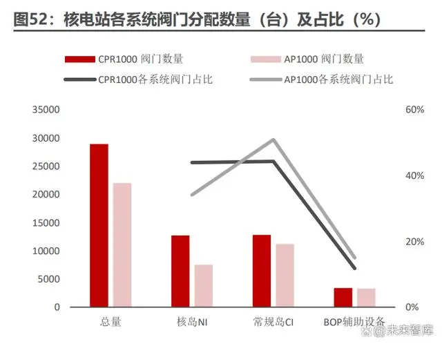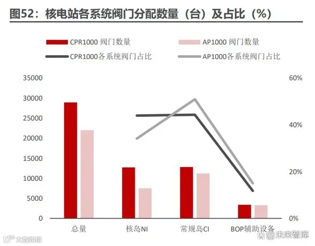 核电阀门是核电站中关键的承压和介质输送控制设备,连接众多系统,调节介 质参数,保护设备安全。以 AP1000 核电机组为例,需要阀门约 22000 台,主要 应用于核岛、常规岛和 BOP 辅助设备。核 I 级阀门主要负责反应堆和冷却剂系统;核 II 级阀门在事故工况下具备安全功能;核 III 级阀门与反应堆运行密切相关。在 单台机组中,非核级阀门占比高达 84%,核 III 级阀门位居其次。