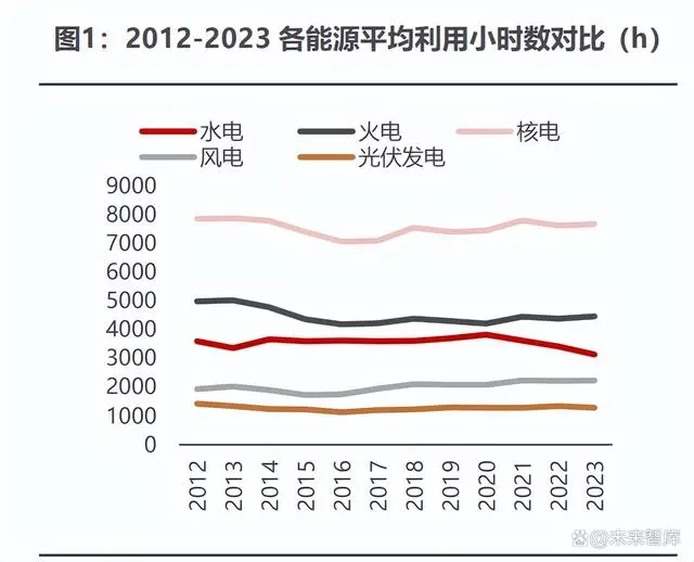 核电持续稳定发电,发电利用时长远优于其他电源。核电发电平稳,其平均利 用小时数遥遥领先,远超火电、水电等其他能源。2023 年核电平均利用小时数高 达 7670h,约为风电的 3.45 倍、火电的 1.72 倍、光伏的 5.96 倍,近三年均保持 在 7500h 以上。因此,核电可依托其高度稳定性和可靠性作为基荷能源运行,与 水电、火电形成互补效应。