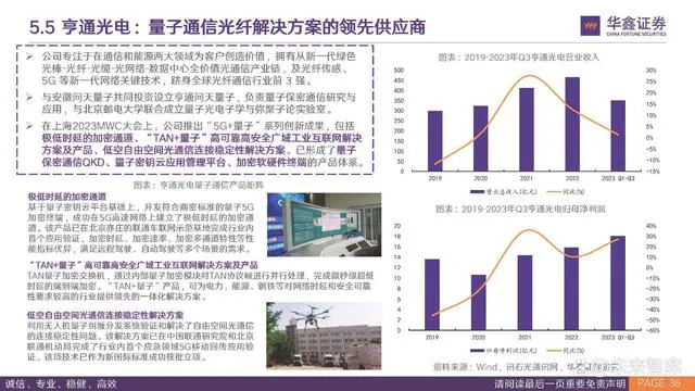公司专注于在通信和能源两大领域为客户创造价值,拥有从新一代绿色 光棒-光纤-光缆-光网络-数据中心全价值光通信产业链,及光纤传感、 5G 等新一代网络关键技术,跻身全球光纤通信行业前 3 强。与安徽问天量子共同投资设立亨通问天量子,负责量子保密通信研究与 应用,与北京邮电大学联合成立量子光电子学与弥聚子论实验室。在上海2023MWC大会上,公司推出“5G+量子”系列创新成果,包括 极低时延的加密通道、“TAN+量子”高可靠高安全广域工业互联网解决 方案及产品、低空自由空间光通信连接稳定性解决方案。已形成了量子 保密通信QKD、量子密钥云应用管理平台、加密软硬件终端的产品体系。
