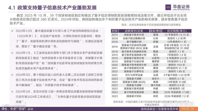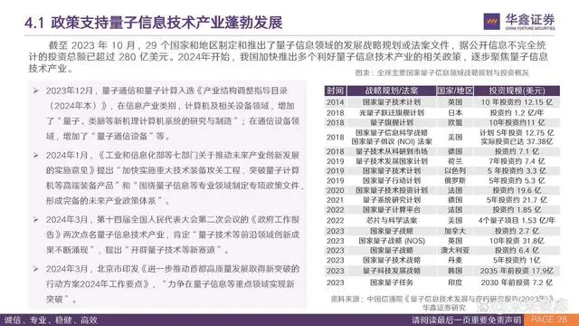 截至 2023 年 10 月,29 个国家和地区制定和推出了量子信息领域的发展战略规划或法案文件,据公开信息不完全统 计的投资总额已超过 280 亿美元。2024年开始,我国加快推出多个利好量子信息技术产业的相关政策,逐步聚焦量子信息 技术产业。