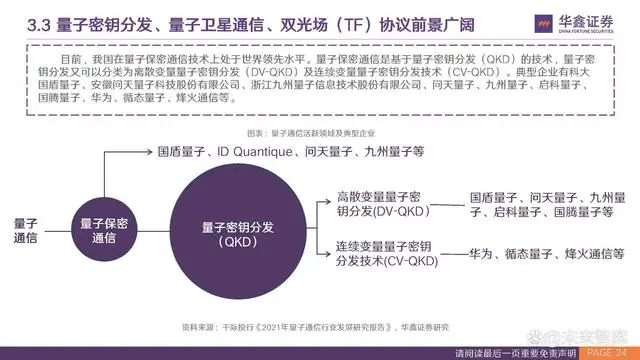 目前,我国在量子保密通信技术上处于世界领先水平。量子保密通信是基于量子密钥分发(QKD)的技术,量子密 钥分发又可以分类为离散变量量子密钥分发(DV-QKD)及连续变量量子密钥分发技术(CV-QKD)。典型企业有科大 国盾量子、安徽问天量子科技股份有限公司、浙江九州量子信息技术股份有限公司、问天量子、九州量子、启科量子、 国腾量子、华为、循态量子、烽火通信等。