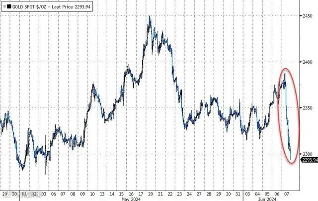 美国5月非农就业报告意外强劲,粉碎了年内提前降息的希望,叠加中国央行暂停增持黄金,金价周五跌破每盎司2300美元,创近三年来最大跌幅。目前现货黄金报2293.77美元/盎司,跌幅为-3.45%。