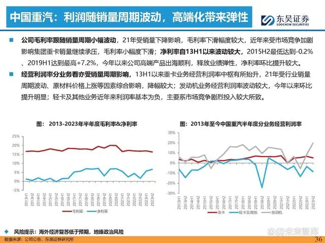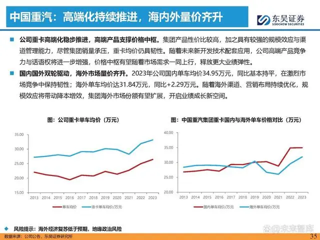 公司重卡高端化稳步推进,高端产品支撑价格中枢。集团产品性价比较高,加之具有较强的规模效应与渠 道管理能力,尽管集团销量承压,重卡均价仍具韧性。随着未来新开发技术配套应用,公司高端产品竞争 力与话语权将进一步增强,价格中枢有望随着市场需求一同上行,释放更大业绩弹性。