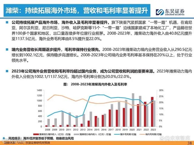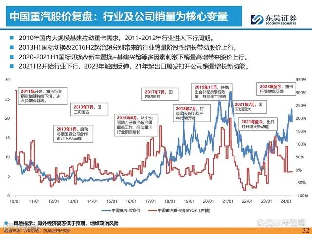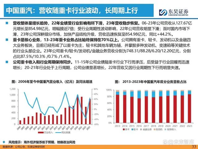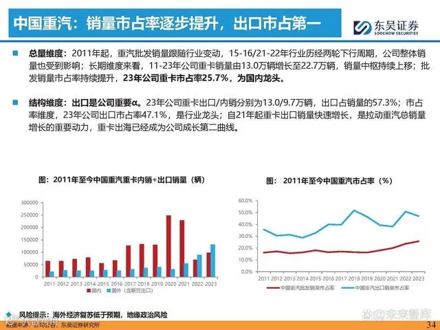 中国重汽重卡整车出口市占率断崖式领先:23年国内 重卡整车出口7.5万辆,其中中国重汽重卡整车出口5.9 万辆,占比78.9%,位列行业第一。中国重汽、陕重汽半挂牵引车出口市占率较高:23年 国内半挂牵引车出口13.6万辆,其中重汽、陕重汽分 别出口5.9/2.2万辆,占比分别43.5%/16.5%,CR2合计占比60.0%。陕重汽重卡底盘出口市占率行业第一:23年国内重卡 底盘出口6.5万辆,其中陕重汽重卡底盘出口3.4万辆, 占比52.5%。